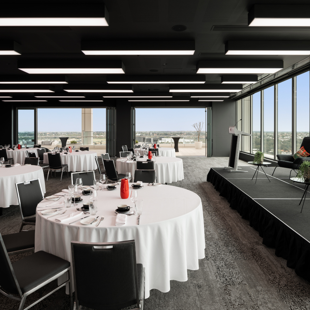 Take your event to the next level in our stunning Rooftop Ballroom. Featuring floor-to-ceiling windows with panoramic views of the Swan River and Perth skyline, this breathtaking space sets the perfect backdrop for corporate functions, galas, weddings and milestone celebrations. Whether you’re hosting a sophisticated cocktail party or a high-impact business event, the Rooftop Ballroom delivers an unforgettable setting.