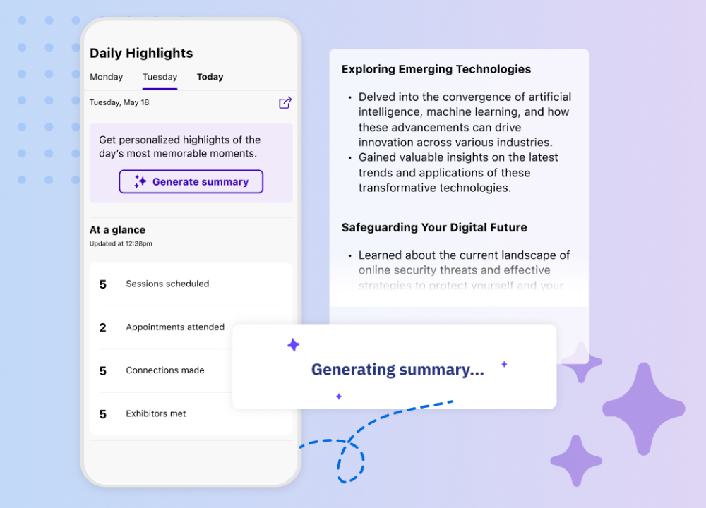 Session Snapshots is just one example of CventIQ in action. This expansive intelligence layer acts as your built-in partner, automating time-consuming tasks across the entire event lifecycle. CventIQ can save your team hours by helping with everything from writing event content and creating social media posts to summarising event feedback and getting smart recommendations on the right people and sessions.