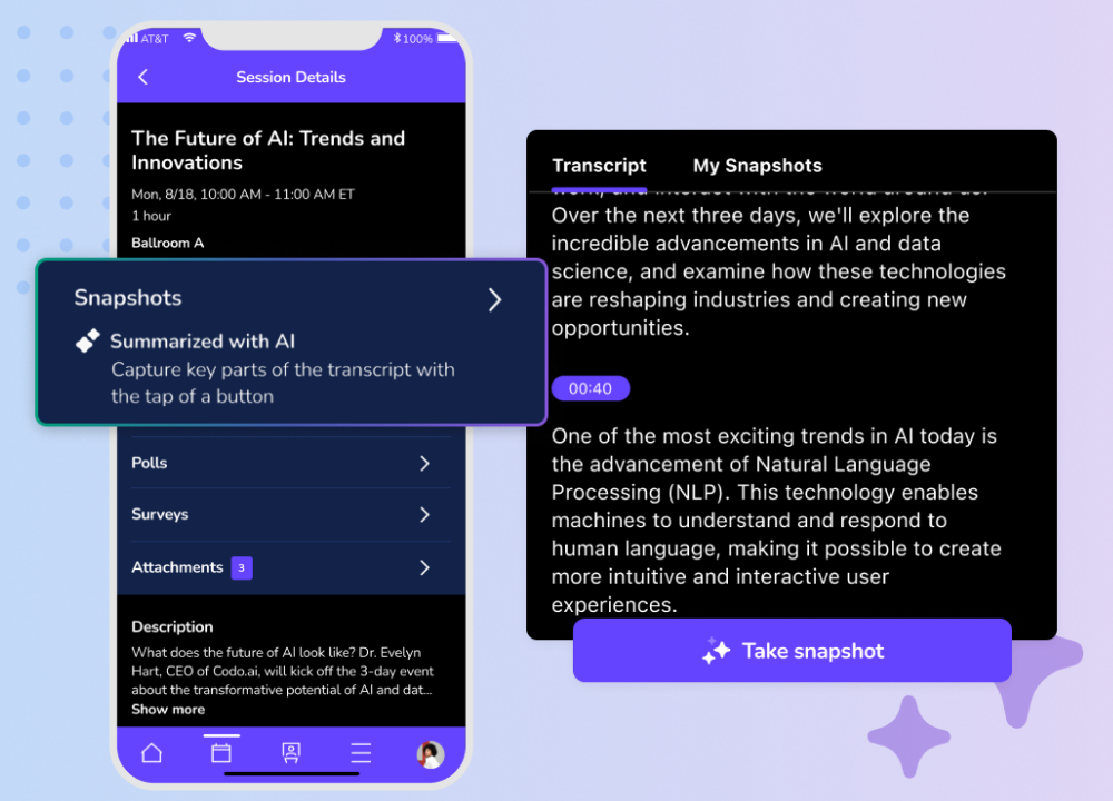 The Session Snapshot feature, powered by CventIQ and available in the Cvent Attendee Hub app, provides a real-time, accurate transcript of the speaker’s words directly in the event app, with virtually zero lag.